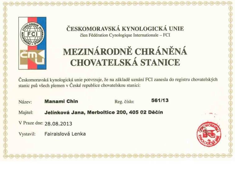Certifikát CHS:Chovatelská stanice